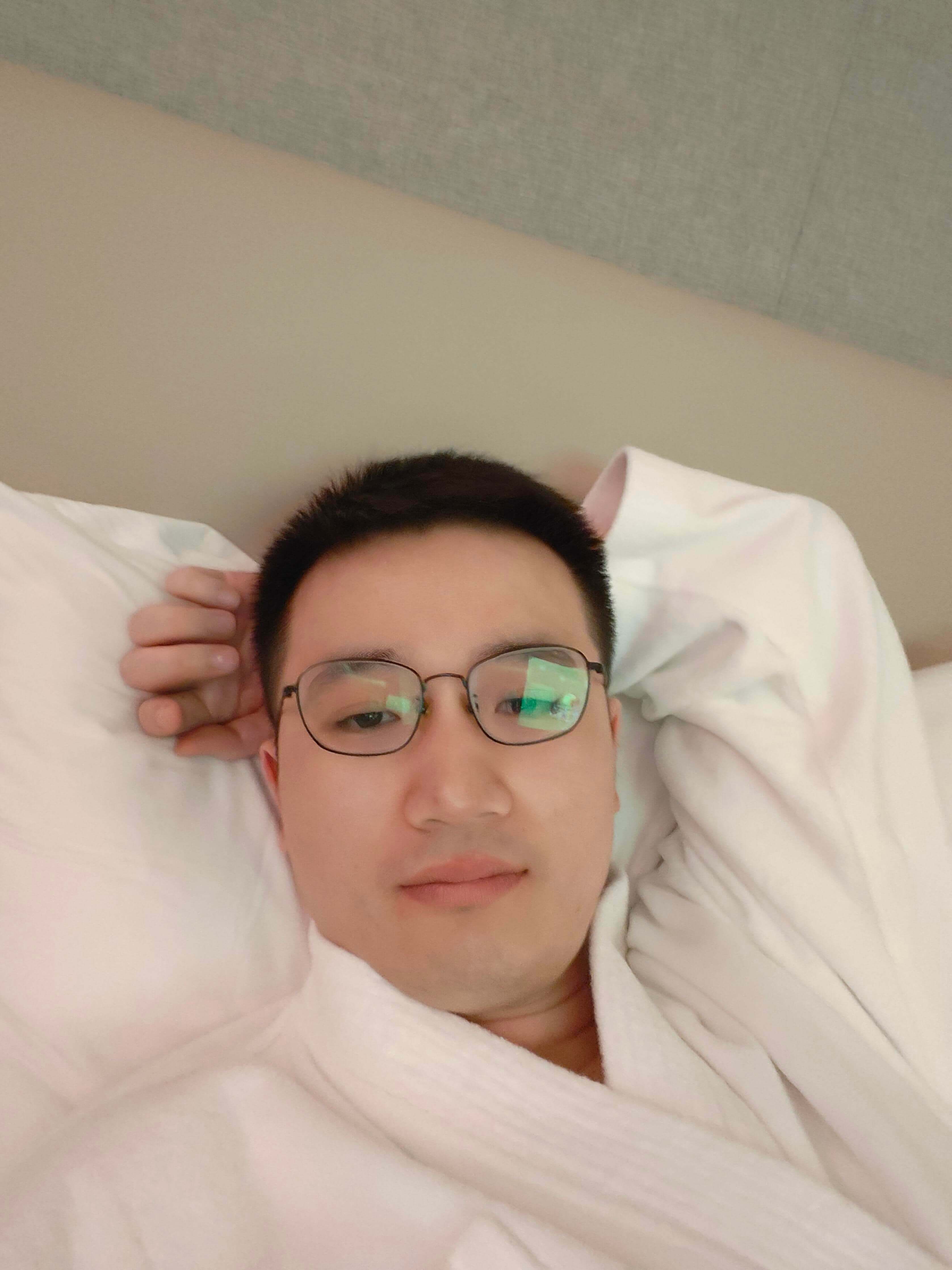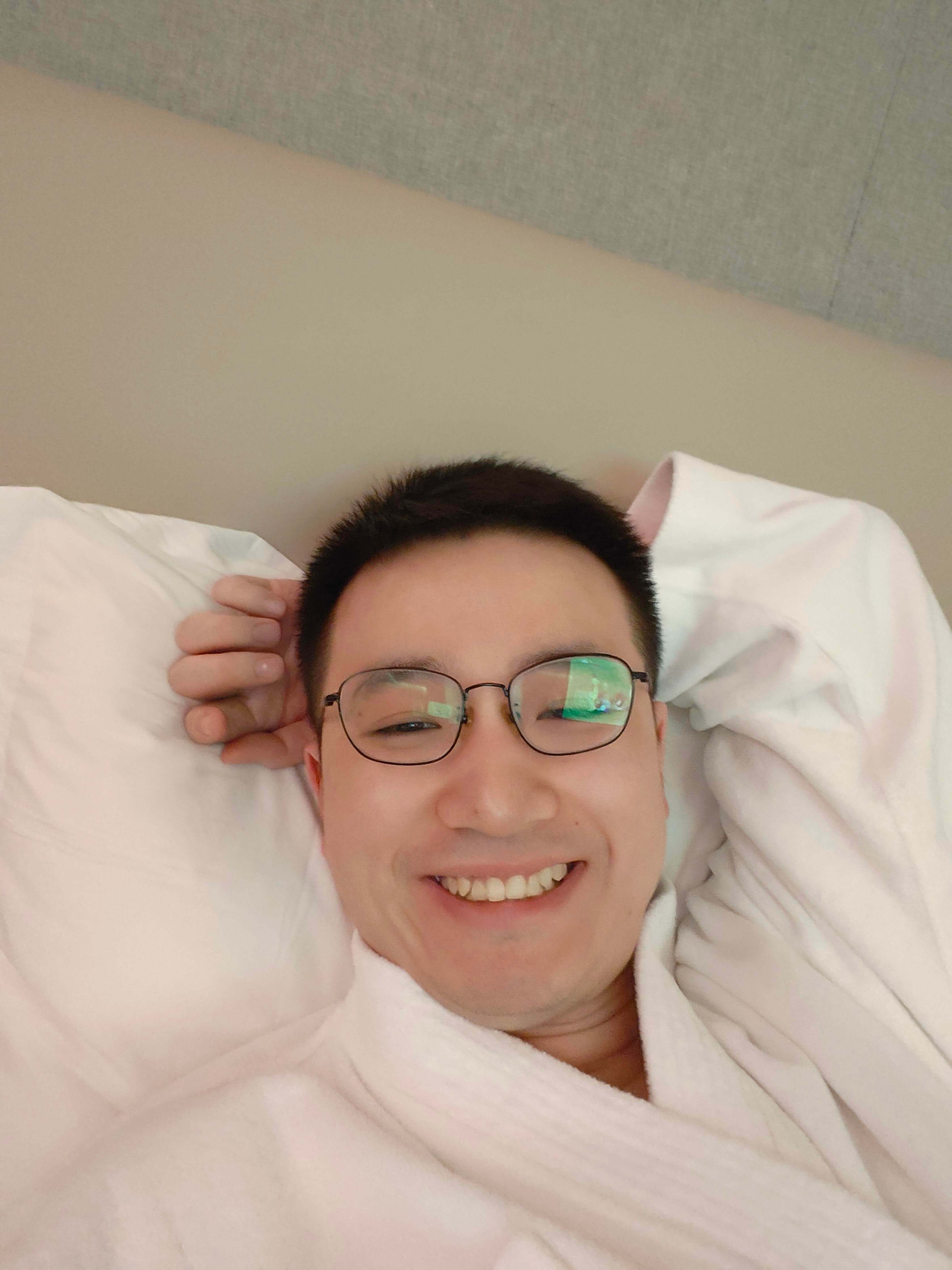 后两张图片则展示了一位戴眼镜的年轻男子,同样在床上,表情从严肃转为大笑。他看起来很放松,似乎对生活充满了自信和满足感。这两张照片与前两张形成了鲜明的对比,尤其是当结合补充信息“中年男人的油腻和自信”时,观众会发现这种对比更加突出了“油腻”的幽默感。