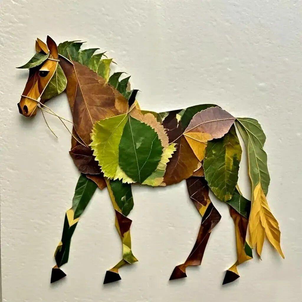 首先,图片中的牛和马是由各种颜色和形状的树叶组成的,这种独特的创作方式本身就具有视觉上的吸引力和新奇感。艺术家通过精心挑选和排列树叶,成功地捕捉到了牛和马的基本特征,如牛的角、马的鬃毛等,让人一眼就能认出这是牛和马。