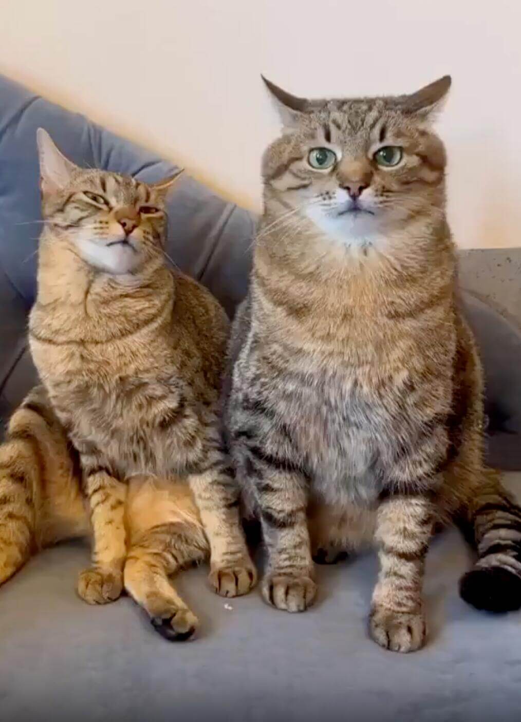 第一张图片中,一位女生和一只戴着蓝色蝴蝶结的猫咪并排躺着,两者的面部表情和五官特征非常相似,尤其是大眼睛和圆脸,看起来像是双胞胎。这种高度的相似性让人忍俊不禁,尤其是配上文字“朋友说我自己都生不出这么像的”,更加强调了这种巧合的荒诞感,制造出一种“猫比人还像自己”的幽默效果。 第二张图片展示了一个机甲模型,其头部是一个卡通兔子形象,有着可爱的笑脸和兔耳朵,与下方复杂的机械结构形成强烈反差。这种“萌系头+硬核机甲”的组合本身就充满违和感,而它站在一张印有卡通人物的桌垫上,进一步增强了童趣与科幻的混搭感,令人觉得既可爱又滑稽。 第三张图片中有两只虎斑猫并排坐着,左边的猫眯着眼睛,右边的猫则瞪大眼睛直视镜头,两者神态截然不同,但毛色和体型几乎一模一样。它们坐在一起时,仿佛在上演一场“猫界双面人生”的戏剧,一个慵懒、一个警觉,这种对比带来了强烈的喜剧效果。 第四张图片是一只戴着老虎造型帽子的猫,帽子上有虎耳和条纹,猫本身也恰好是虎斑猫,因此整体看起来就像一只真正的老虎。背景中还有一个人躺在石头上,似乎在休息,而猫却正对着镜头“严肃”地盯着,仿佛在守护领地。这种“小猫扮大王”的反差,加上猫的表情一本正经,产生了极强的搞笑效果,尤其当观众意识到这其实是一只普通家猫时,笑点更加突出。