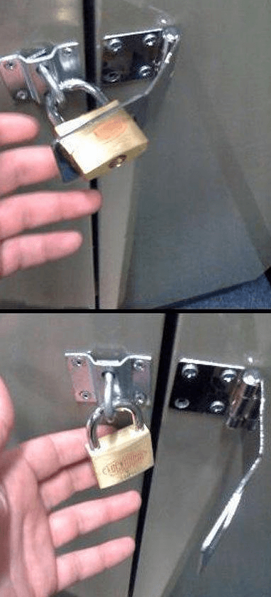 这张图片展示了一个看似安全的锁具,但实际上存在一个明显的漏洞,因此显得幽默好笑。