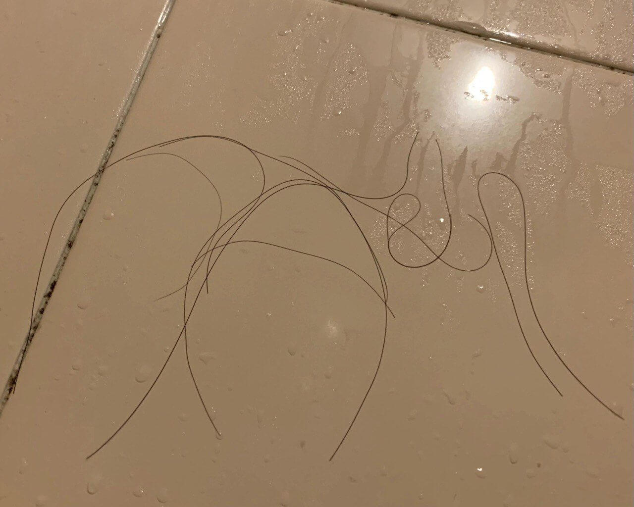 这张图片展示了一些散落在光滑瓷砖地面上的头发。这些头发看起来像是在浴室或淋浴间里,因为地面上有水滴。幽默之处在于头发的排列方式和形状让人联想到某种生物或怪物的触手,仿佛它们在地板上蠕动。这种视觉上的错觉和意外的联想常常会引发人们的笑声,因为它打破了我们对日常物品(如掉落的头发)的常规认知,赋予了它们一种意想不到的生命力和趣味性。