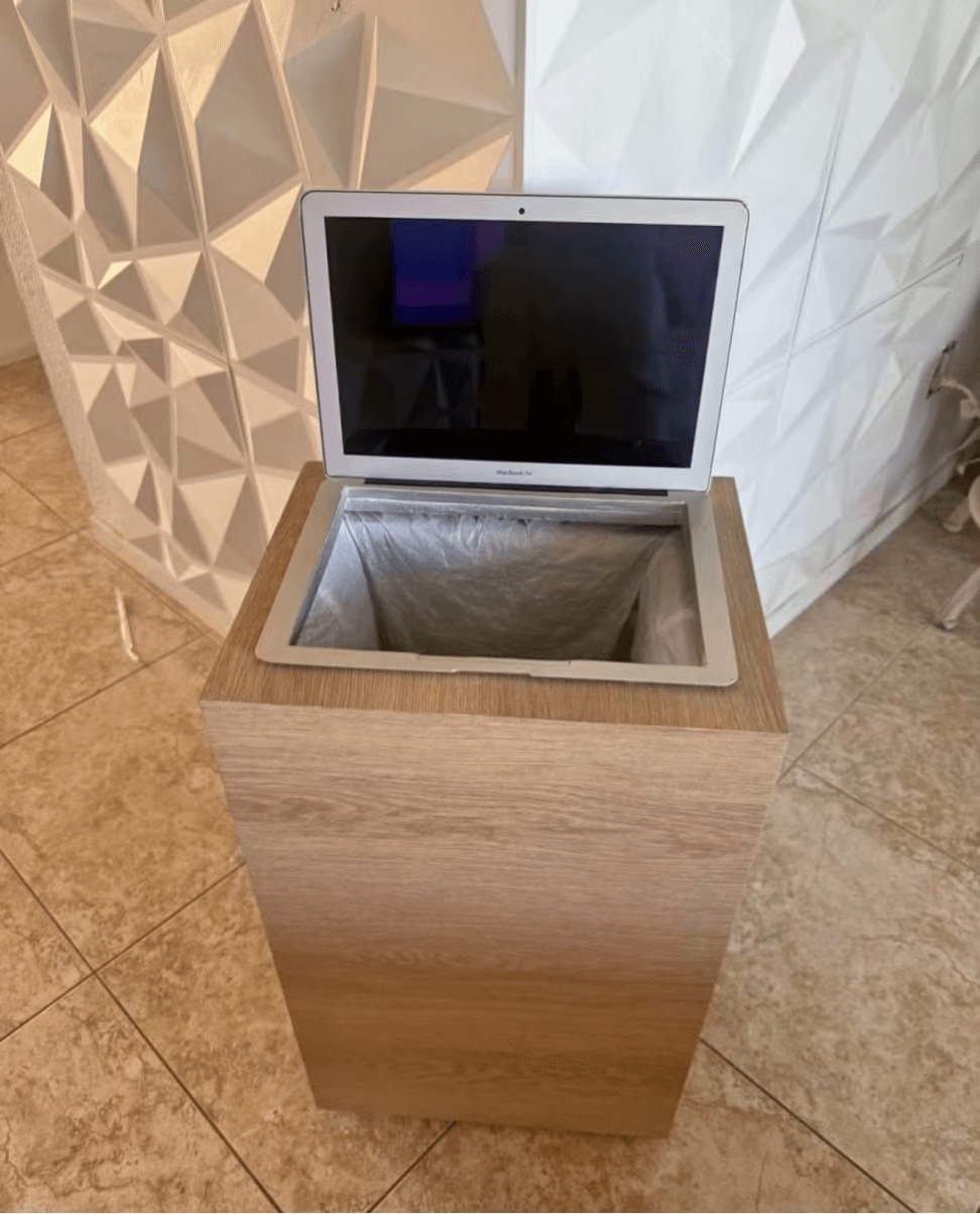 此外,这种设计也讽刺了现代人对科技产品的迷恋和对极简美学的追求。一个垃圾桶竟然伪装成一台MacBook,既荒诞又合理,因为它完美地融入了现代家居环境,甚至可能让人在使用时产生一种“我在用高科技”的错觉。这种将实用物品伪装成高端电子产品的创意,既令人惊讶又忍不住发笑。