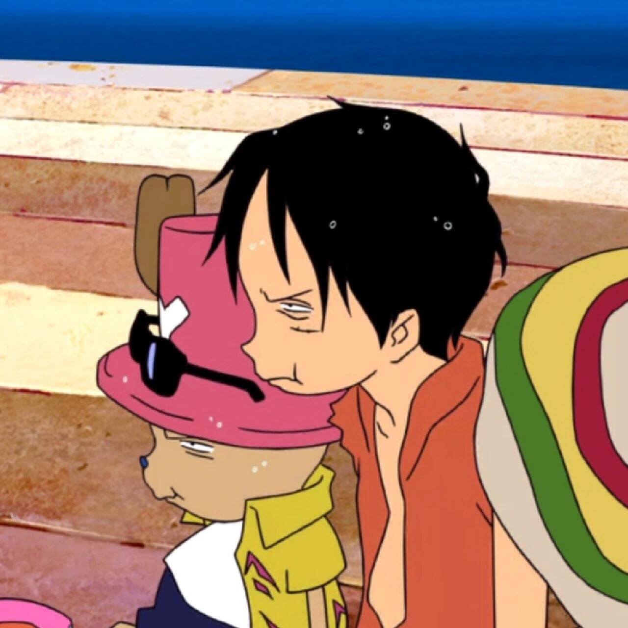4. 第四张图是路飞和乔巴的对比:路飞还在笑,而乔巴已经累得闭上眼睛,头靠在路飞肩上。这种“一个开心到极点,另一个累到不行”的反差制造了幽默效果。