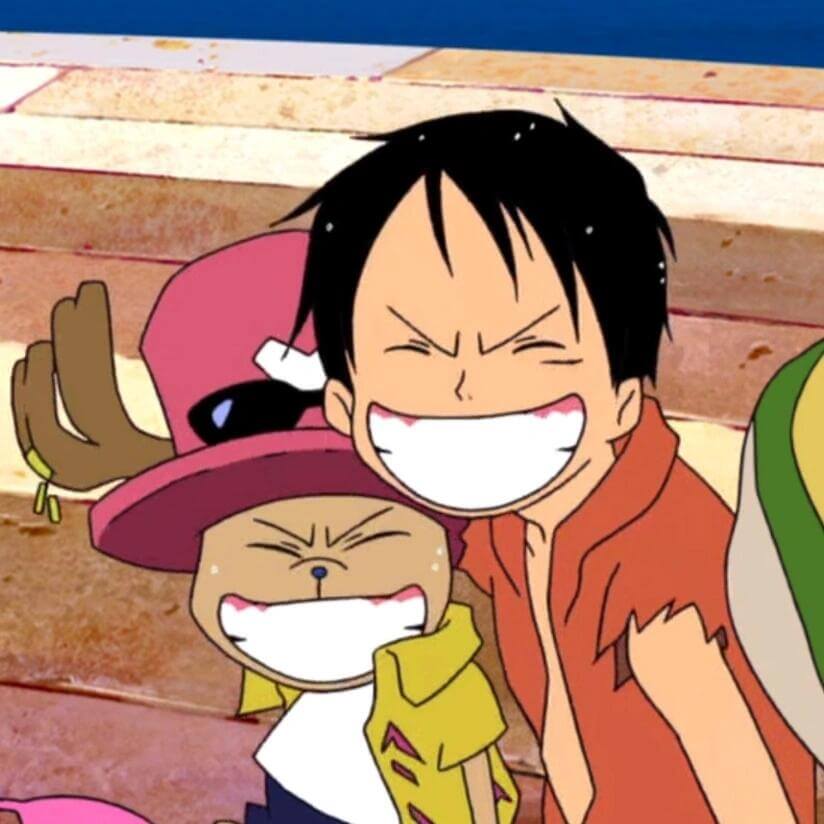 3. 第三张图展示了路飞和乔巴一起大笑的场景。两人都有同样的夸张笑容,而且乔巴头上还戴着一顶粉色帽子,看起来像个小丑。两人同时大笑的同步感加上乔巴的可爱形象,让整个画面显得特别搞笑。