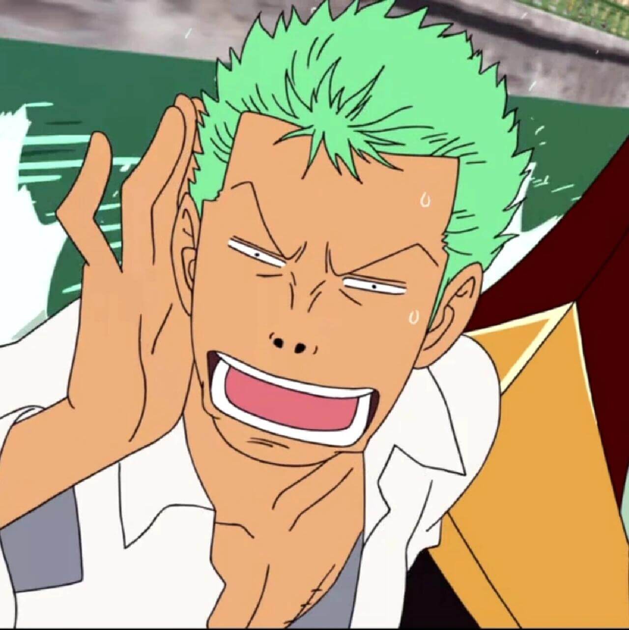 1. 第一张图中,索隆用手遮住脸,只露出眼睛和鼻子,表情显得有些无奈或尴尬。这种“捂脸”动作在动漫中常用来表现角色的羞愧、无奈或对某事感到无语,配合他一贯冷静的形象,形成一种反差萌。