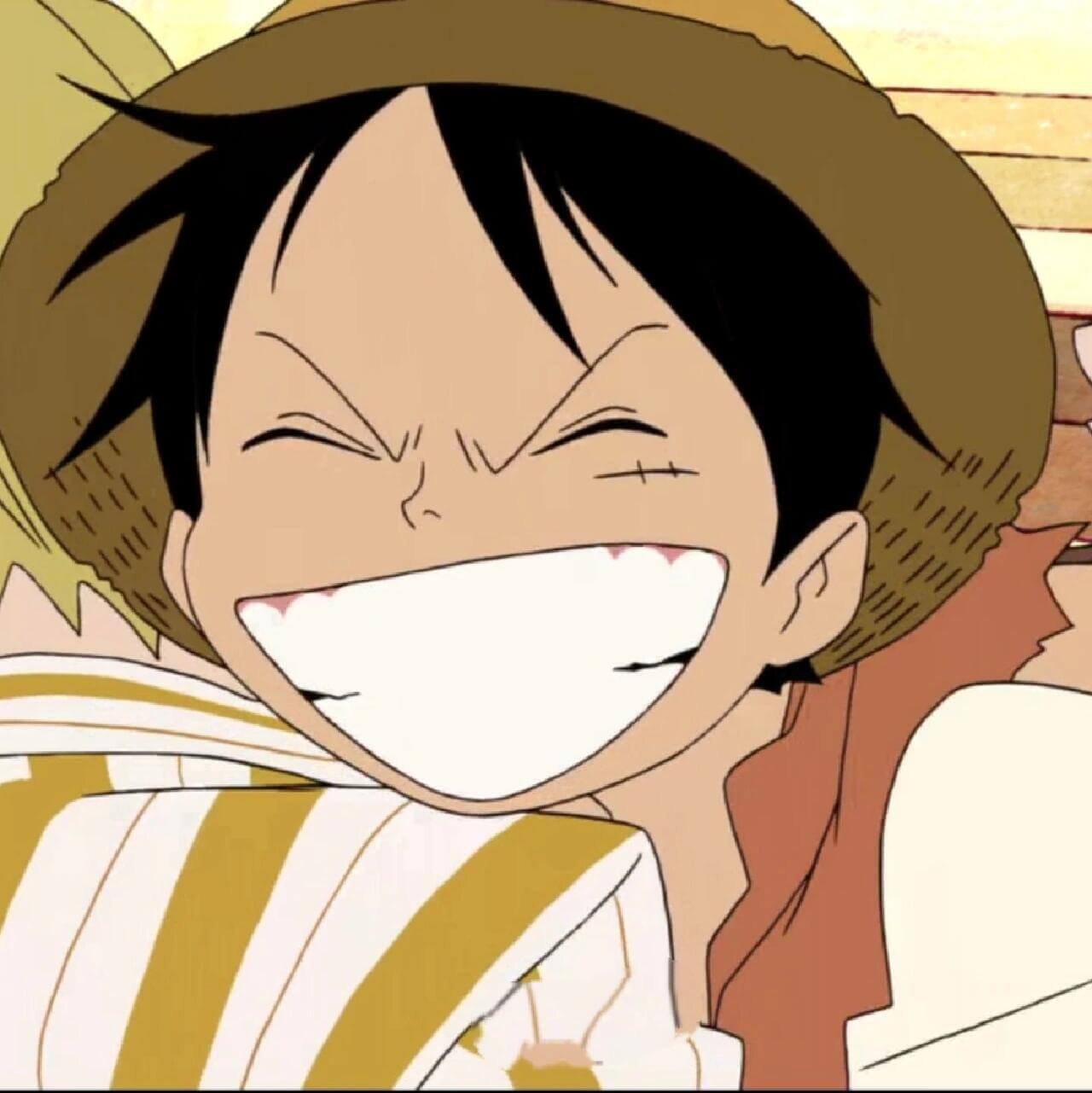 2. 第二张图是路飞大笑的样子,他的笑容非常夸张,眼睛眯成一条线,嘴巴咧到耳根,露出整齐的大白牙。这种极度夸张的笑容与他天真烂漫的性格相符,但因为太过夸张,反而显得滑稽可笑。