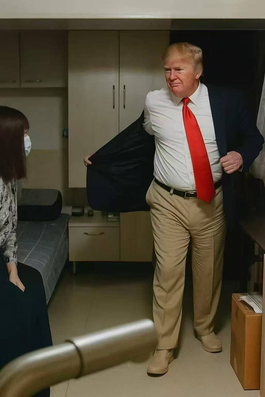 第二张图片则是一个人物在室内脱外套的场景。这个人穿着正式的衬衫和领带,但裤子却是较为休闲的卡其裤,这种正式与休闲的混搭本身就有一种滑稽感。更重要的是,这个人的姿态和表情显得有些夸张,似乎在刻意展示自己的装扮,这增加了画面的喜剧效果。