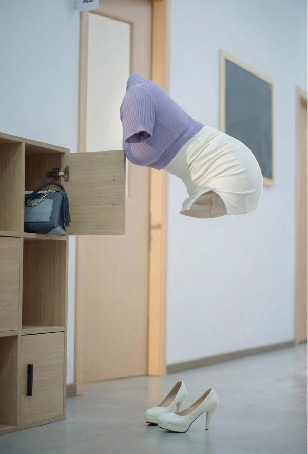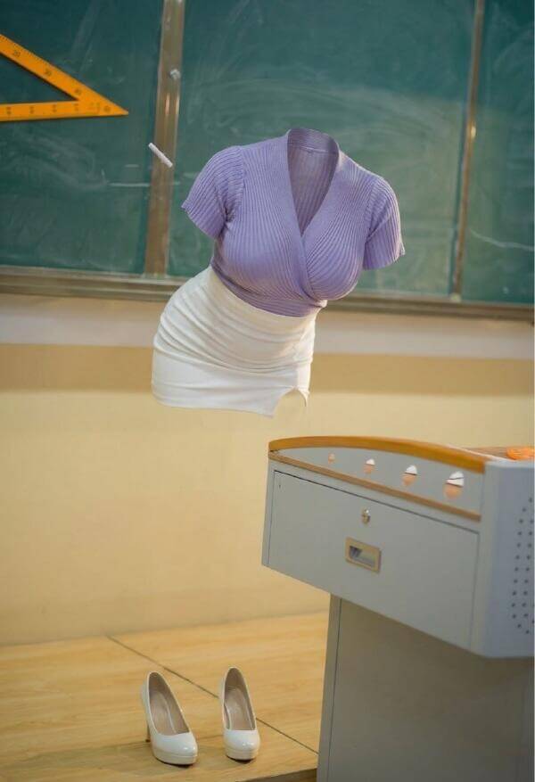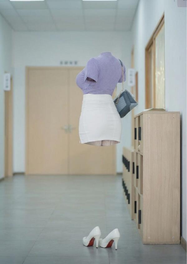 这些图片之所以幽默好笑,是因为它们展示了一种超现实和荒诞的视觉效果。画面中,一个穿着紫色上衣和白色裙子的女性身体部分(从胸部到大腿)悬浮在空中,而她的高跟鞋则放在地上,仿佛她刚刚脱下鞋子准备离开。这种没有头部、四肢的身体部分漂浮在教室或走廊中的场景,打破了人们对正常人体形态的认知,制造出一种诡异又滑稽的感觉。
