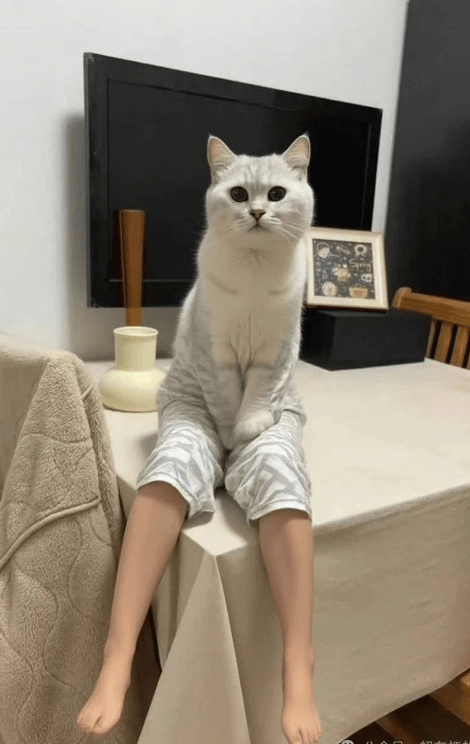 最后,在第三张图片中,这只猫真的“变成了人类”,具体表现为猫的身体上加上了人类的下半身,穿着休闲的家居服,双腿自然下垂,整个画面看起来就像是一个上半身是猫、下半身是人的奇特生物。这种将动物和人类特征结合在一起的创意设计,打破了我们对现实世界的常规认知,产生了强烈的视觉冲击和喜剧效果。