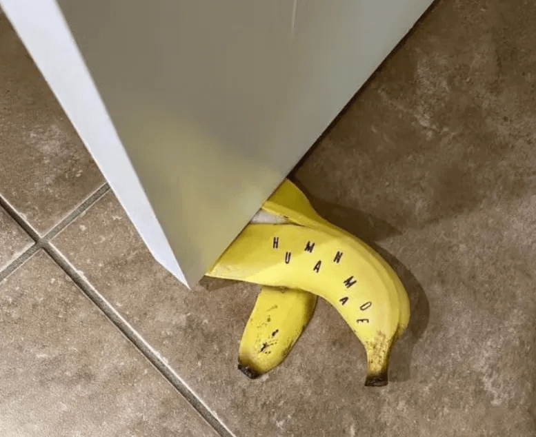 第二张图片进一步揭示了这个“香蕉”的实际用途。它被放置在门下,有效地阻止了门的关闭,起到了门挡的作用。这种设计的幽默之处在于它的创意和实用性之间的对比:一个通常会被丢弃的烂香蕉,竟然变成了一个实用的家居用品。